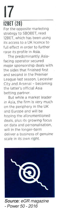 12BET ยักษ์ธุรกิจพนันและคาสิโนออนไลน์ระดับพรีเมียมของเอเชีย ผงาดขึ้นรั้งตำแหน่งสุดยอดแบรนด์ผู้ให้บริการเกมออนไลน์อันดับที่ 17 ของโลก ตามการจัดอันดับล่าสุดของนิตยสาร eGaming Review Magazine